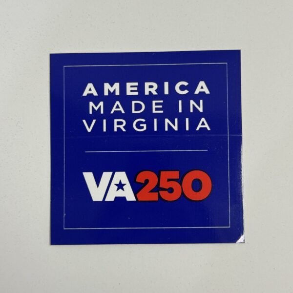 A durable square sticker featuring the American Made in Virginia VA250 design, perfect for adding bold Virginia pride to your everyday gear.