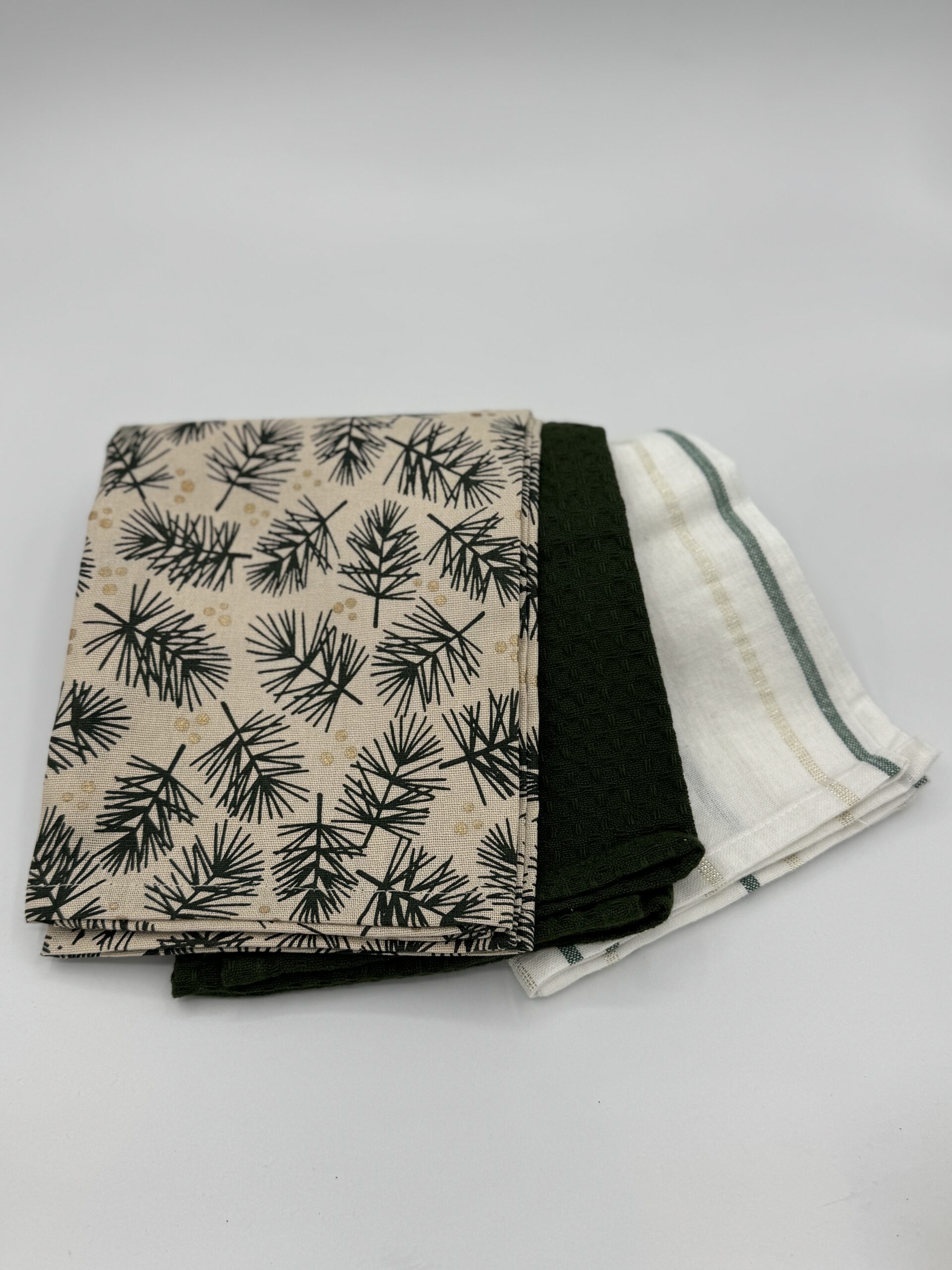 Set of three cotton holiday tea towels with metallic thread. Includes a cream pine and gold berry design, a dark green towel, and a white towel with gold and green stripes.